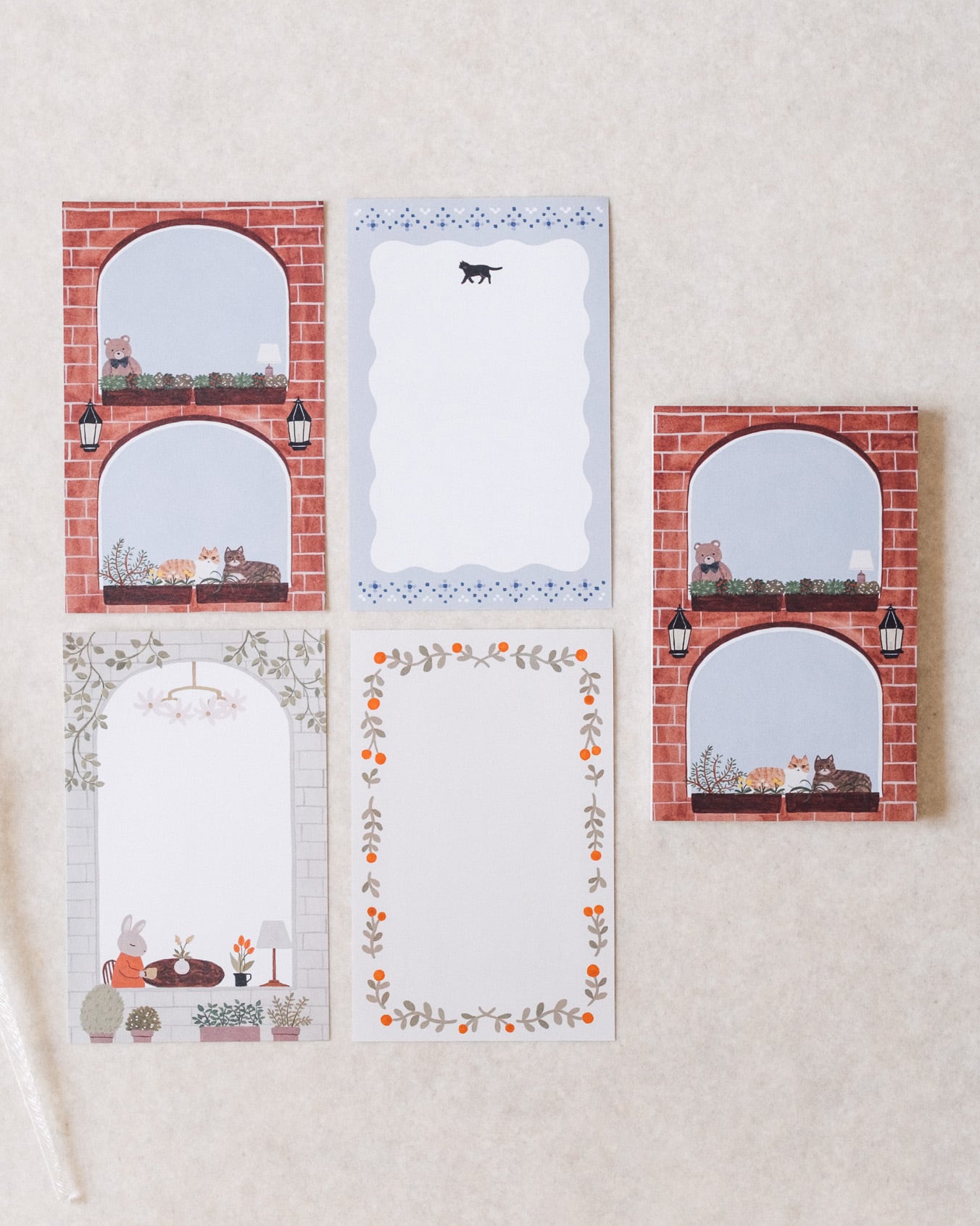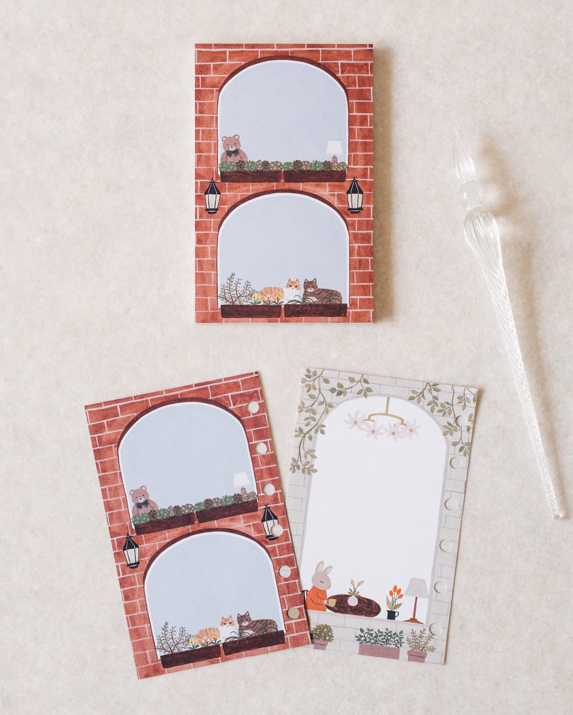 窓から伺えるそれぞれの暮らしテーマに描いたノートパッドです。