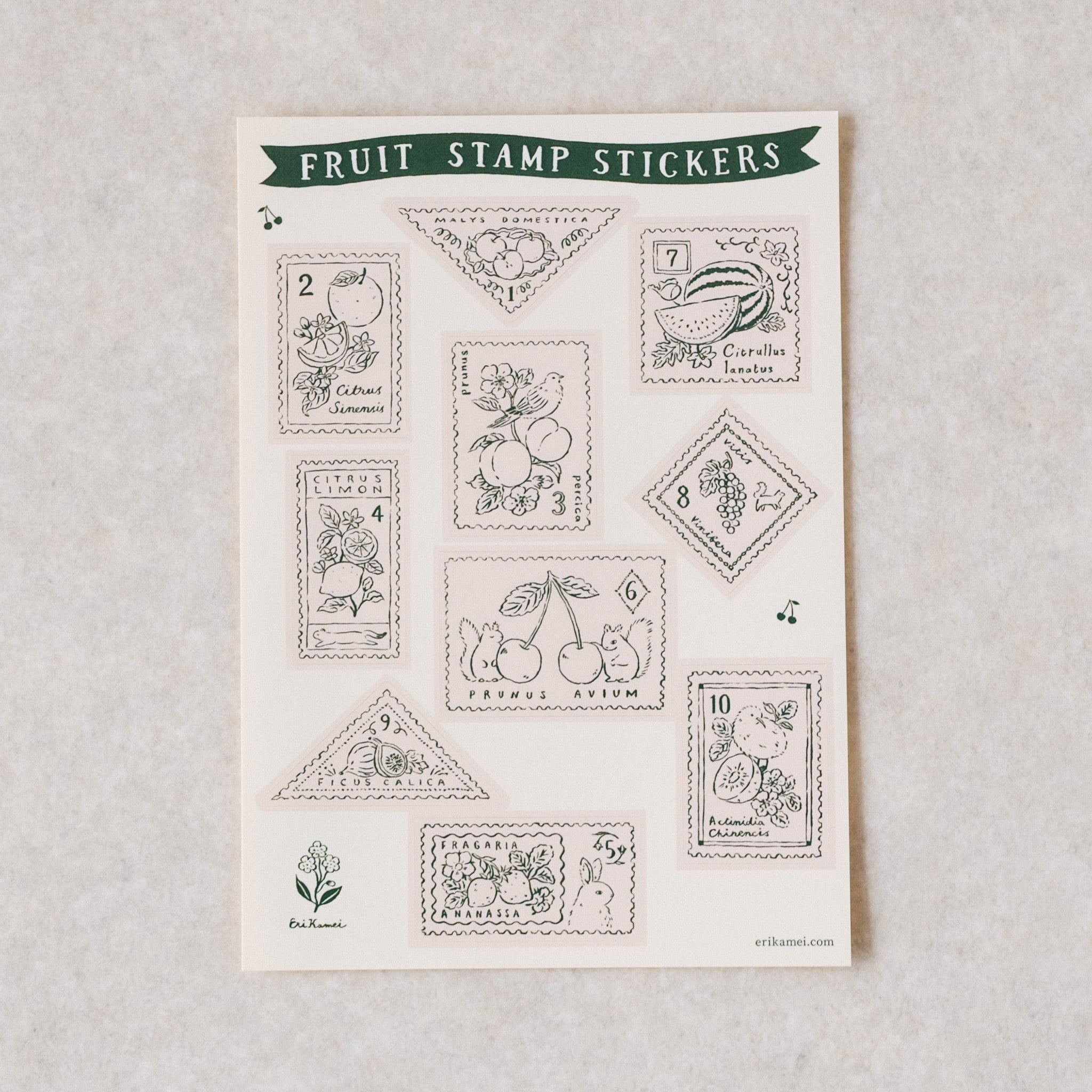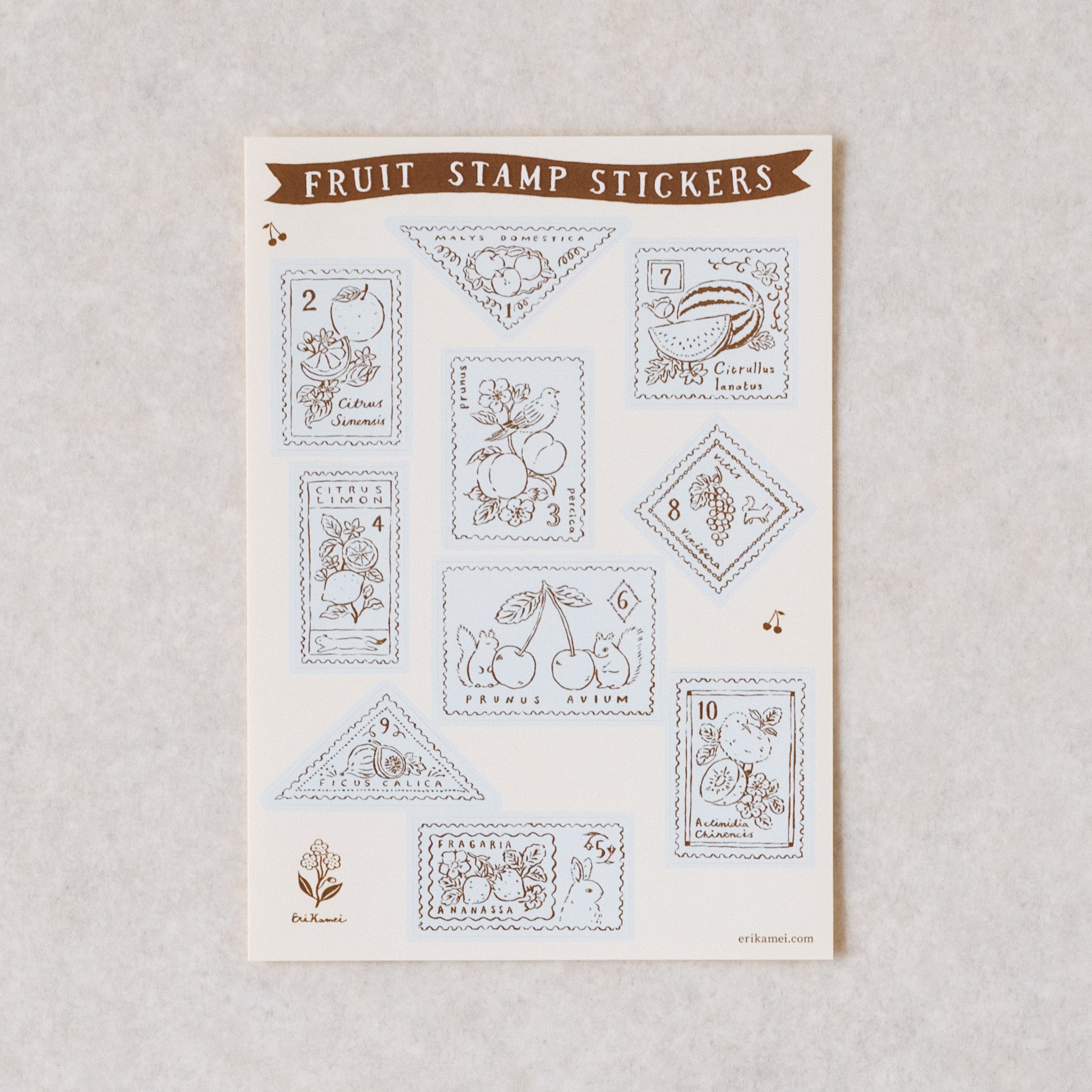 果物をテーマに描いた切手風ステッカー。